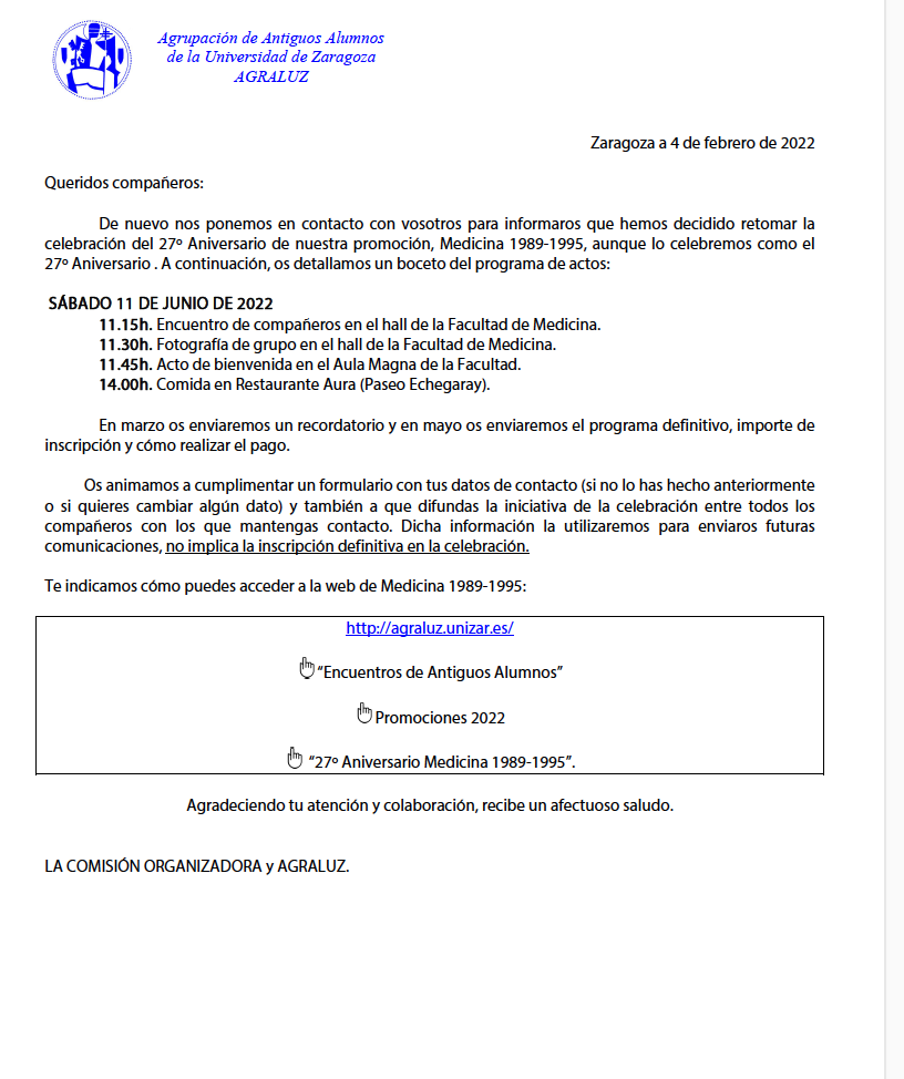27º aniversario de la promoción de Medicina de la Universidad de Zaragoza
