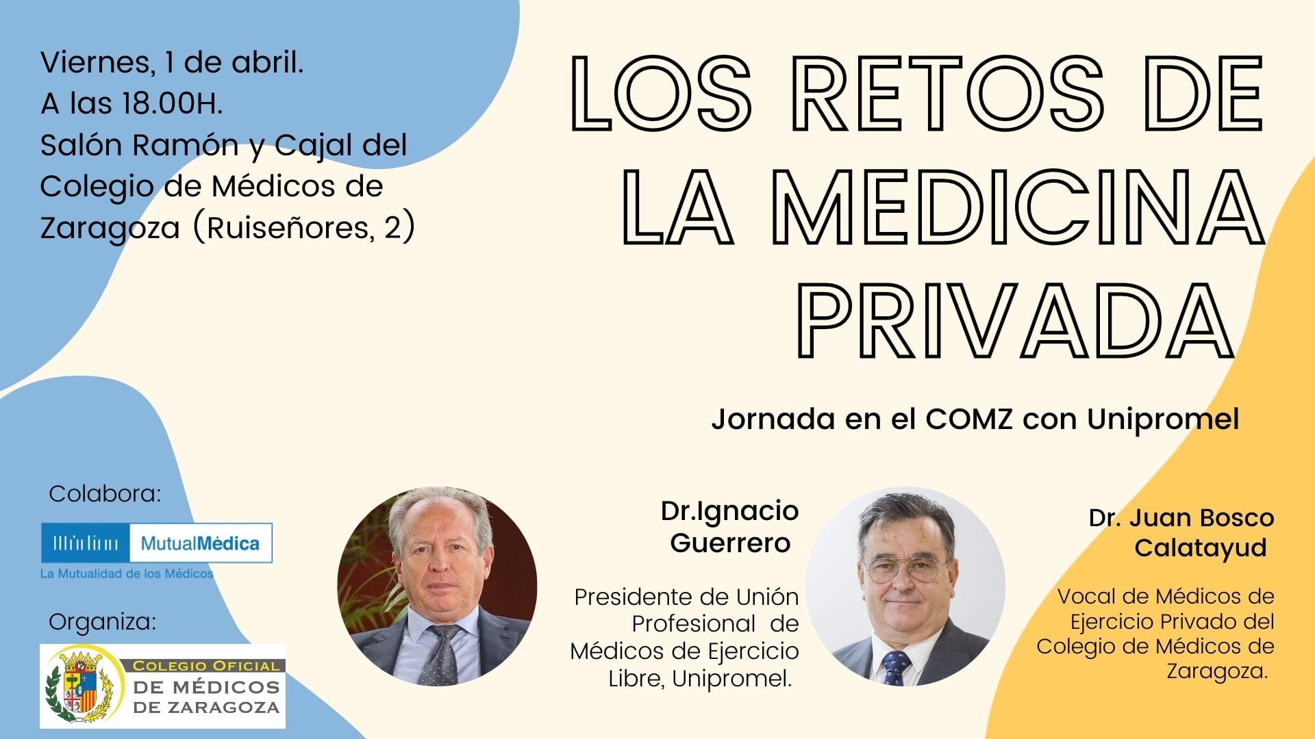 El Colegio de Médicos de Zaragoza (COMZ) organiza esta jornada de la mano de Unión Profesional de Médicos del Ejercicio Libre (Unipromel) el próximo 1 de abril, a las 18:00 horas. Será de forma presencial en el salón de actos Ramón y Cajal ubicado en la sede del COMZ, en Paseo Ruiseñores, 2.