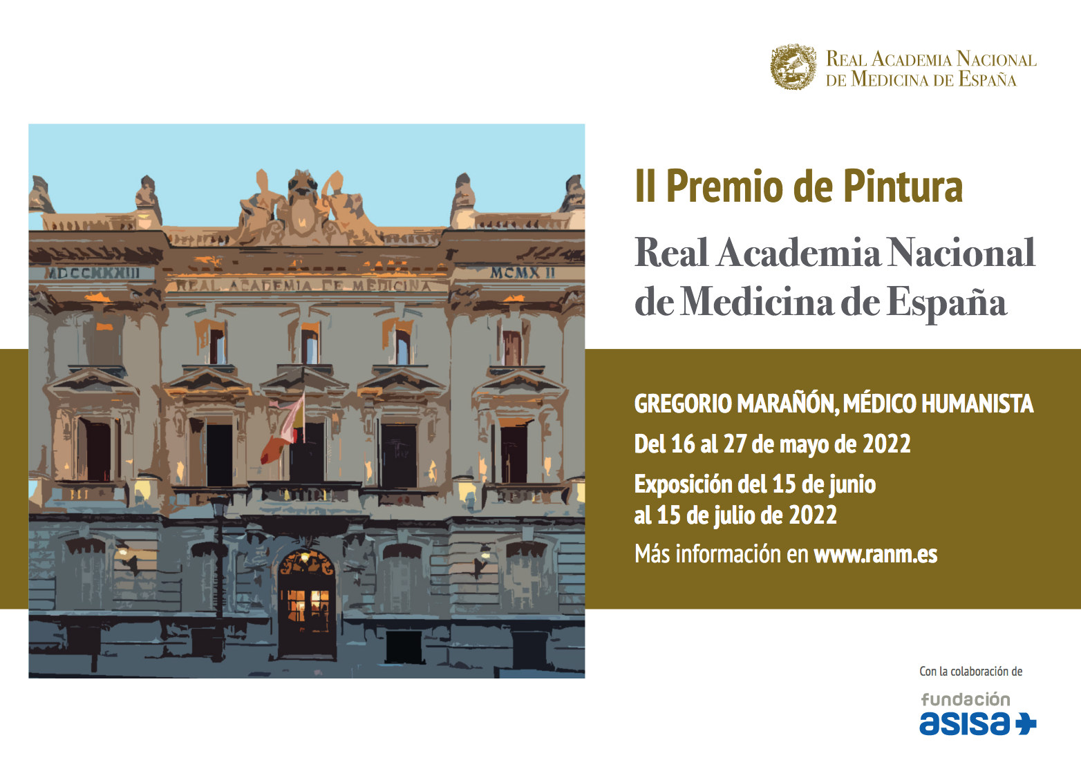 La Real Academia Nacional de Medicina de España (RANME) ha convocado la segunda edición de su Premio de Pintura con el apoyo de Fundación ASISA. Podrán participar en la convocatoria de 2022 todos los pintores españoles o extranjeros residentes en España. El tema del concurso de este año será ‘Retrato del médico humanista D. Gregorio Marañón (1887-1960)’.