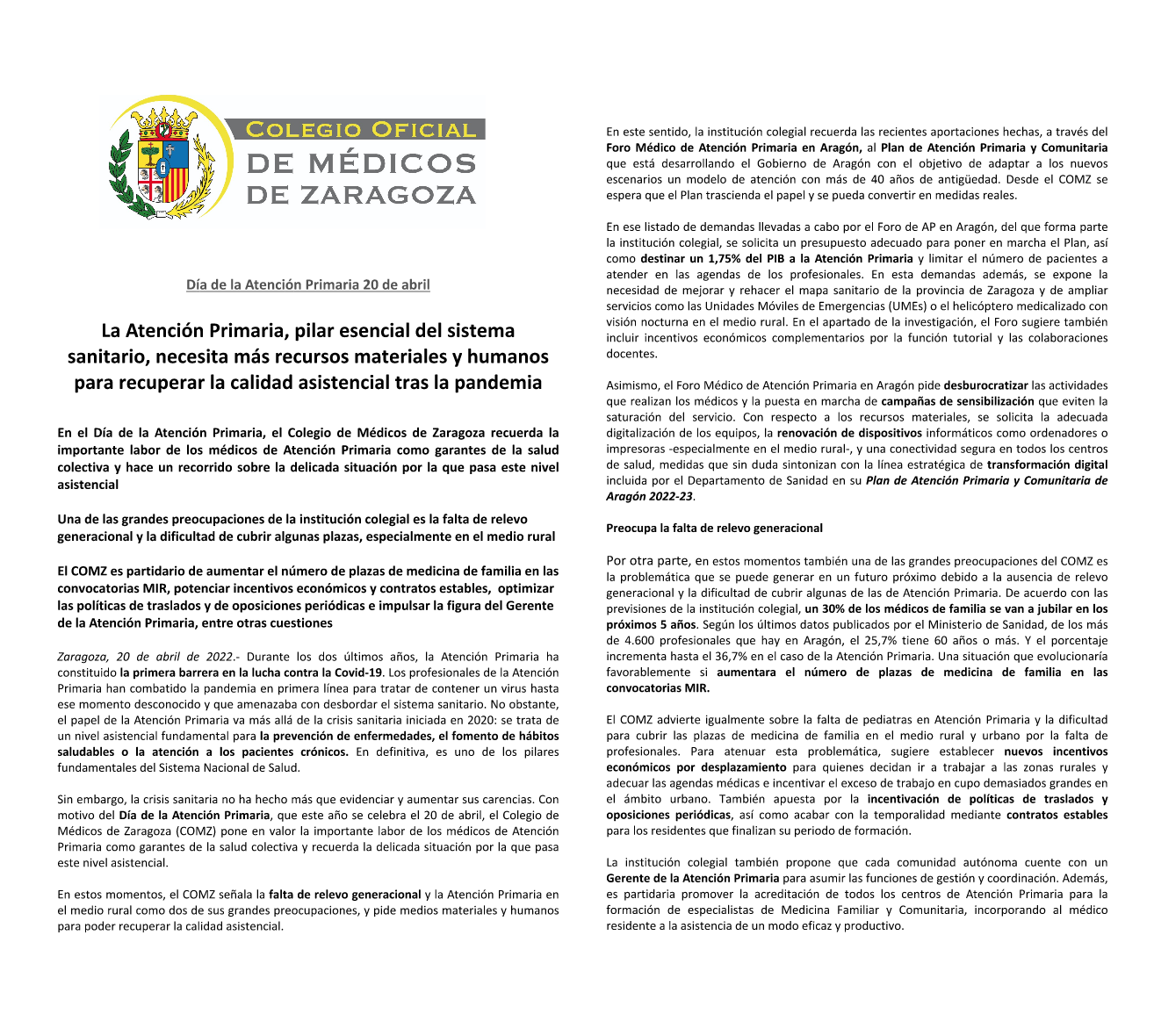 - En el Día de la Atención Primaria, el Colegio de Médicos de Zaragoza recuerda la importante labor de los médicos de Atención Primaria como garantes de la salud colectiva y hace un recorrido sobre la delicada situación por la que pasa este nivel asistencial