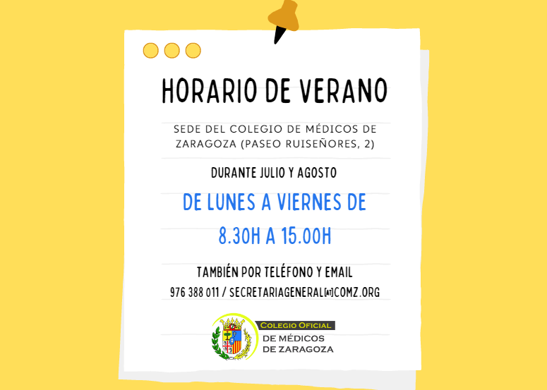 Durante los meses de julio y agosto, la atención al Colegiado en la sede del Colegio de Médicos de Zaragoza (Paseo Ruiseñores, 2) cambia al horario de verano, siendo este de lunes a viernes, de 8.30h a 15.00h.