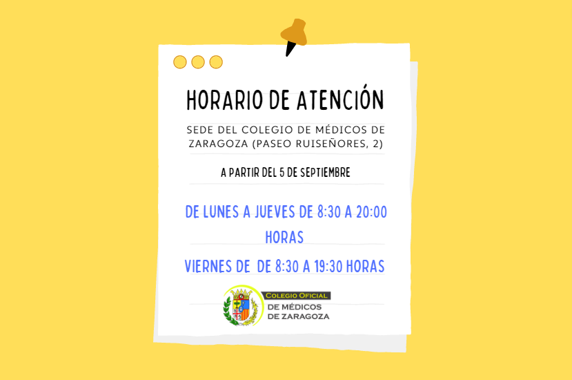 A partir de este lunes 5 de septiembre, las instalaciones del Colegio de Médicos de Zaragoza vuelven a su horario de apertura habitual: