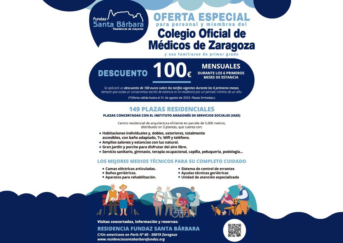El personal y los miembros del Colegio de Médicos de Zaragoza, así como sus familiares de primer grado, pueden beneficiarse de un descuento de 100€ al mes en la residencia de mayores Santa Bárbara, de la la Fundación Asistencial Agustina Zaragoza (FUNDAZ). Esto es posible gracias al convenio firmado hace unas semanas por la institución colegial y la fundación.
