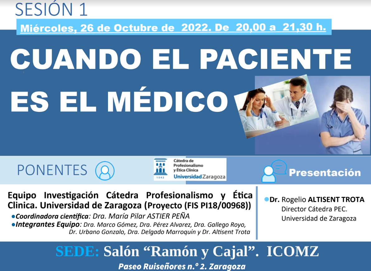 La sesión será impartida por el Dr. Altisent, y consistirá en la proyección de un audiovisual de unos 45 minutos de duración. Esta producción, diseñada para la docencia, es el resultado de un proyecto FIS de la Cátedra de Profesionalismo y Ética Clinica de la Universidad de Zaragoza, dirigido por la Dra. Pilar Astier Peña, coordinadora científica del Equipo de Investigación. El proceso de enfermar en los médicos tiene elementos diferenciales que necesitamos conocer y aprender a gestionar para ser buenos profesionales ante los propios compañeros y los pacientes y para lidiar con nuestra propia vulnerabilidad. Actualmente esta materia no está lo suficientemente presente en la formación médica. Asi pues, esta sesión del Foro tiene un indudable interés formativo, deontológico y para la investigación.