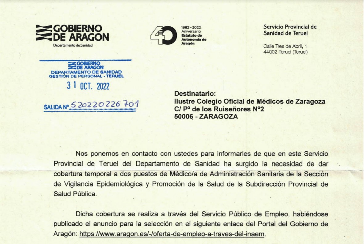 El Servicio Provincial de Teruel del Departamento de Sanidad busca cubrir dos puestos de Médico/a de Administración Sanitaria