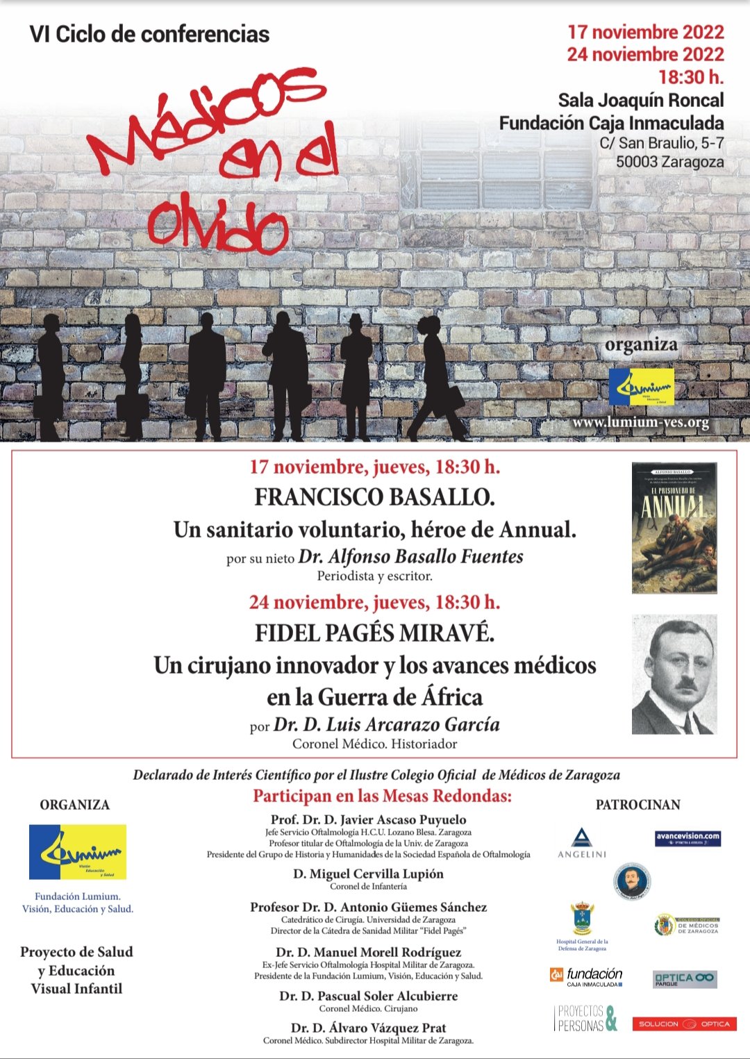 El VI Ciclo de conferencias 'Médicos en el olvido' se celebrará los próximos días 17 y 24 de noviembre en la Sala Joaquín Roncal de la Fundación Caja Inmaculada (C/ San Braulio 5-7). En esta ocasión, se pondrá en valor las biografías de Francisco Basallo y Fidel Pagés Miravé. El ciclo está organizado por la Fundación Lumium-Ves y ha sido declarado de Interés Científico por el Ilustre Colegio Oficial de Médicos de Zaragoza.