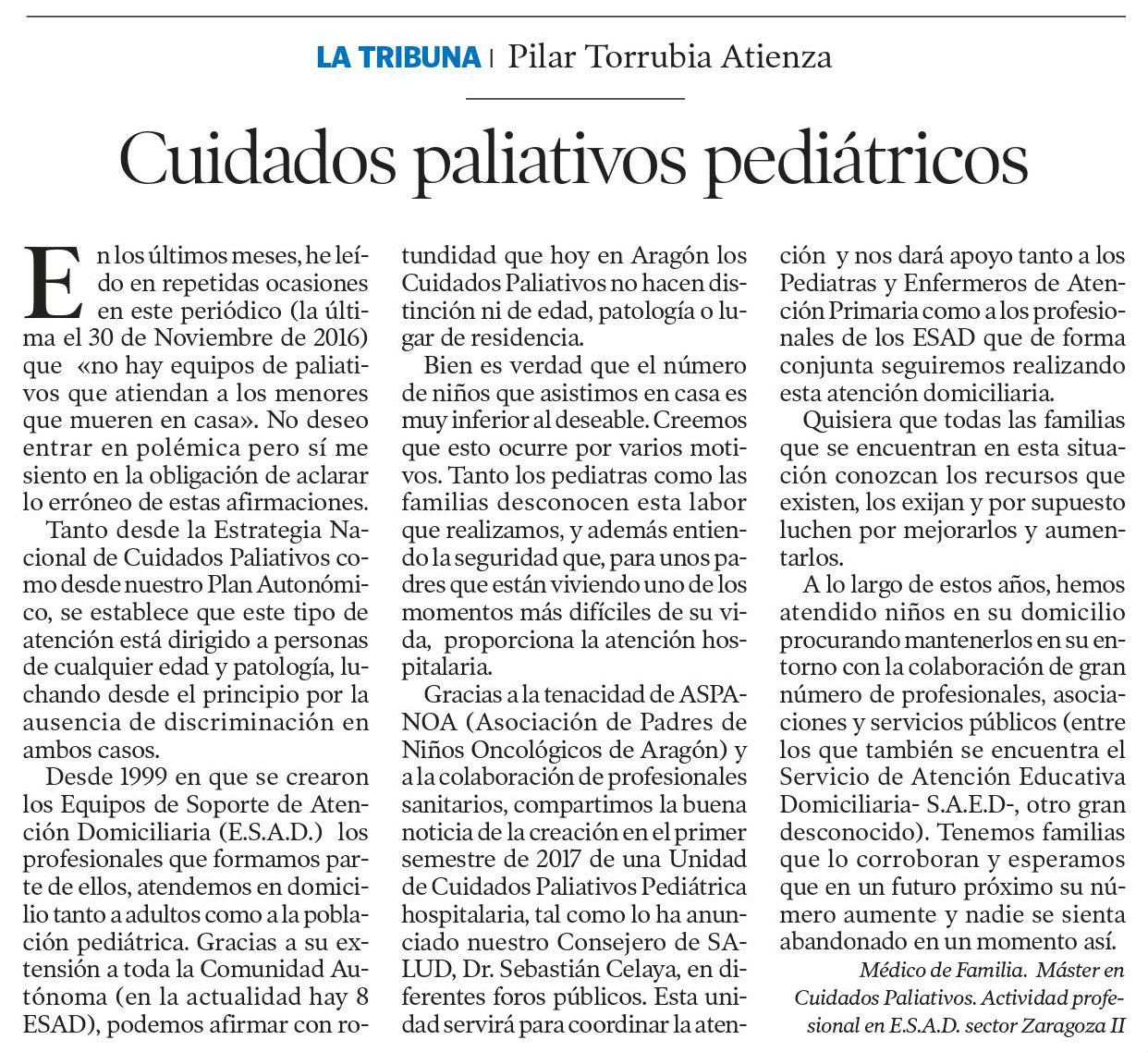 Pilar Torrubia firma la Tribuna que publica Heraldo de Aragón (7/12/2016) sobre Cuidados paliativos pediátricos
