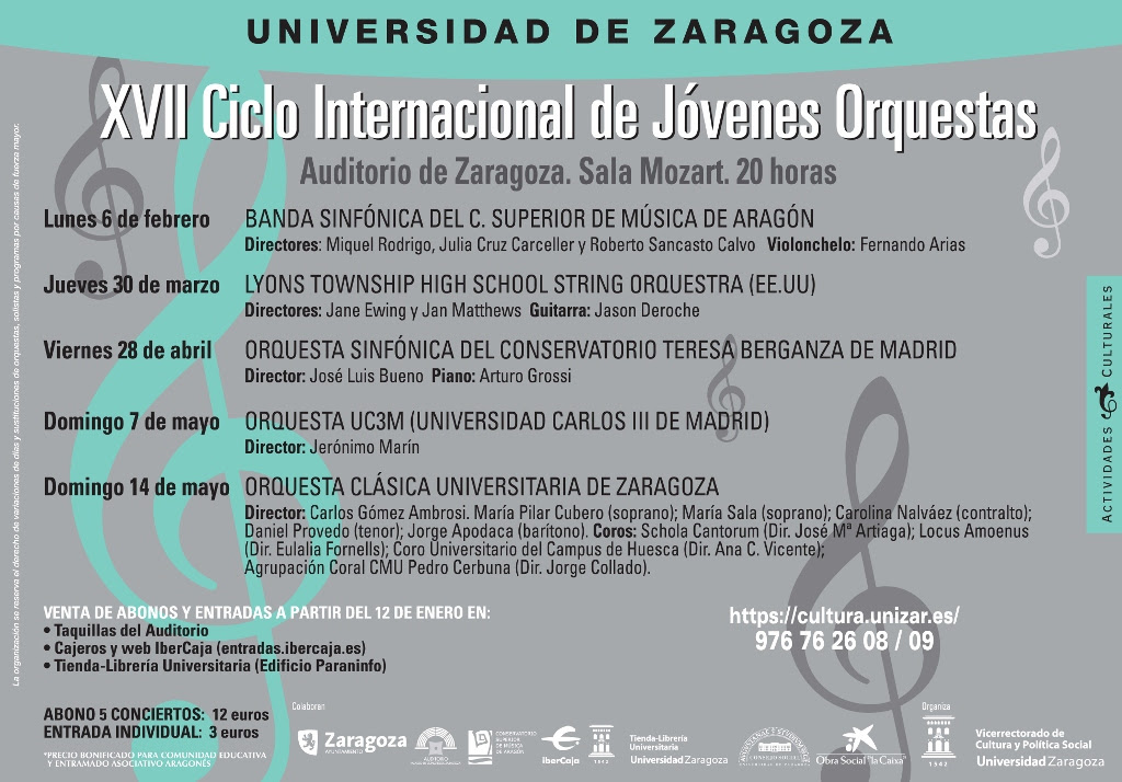Desde el Vicerrectorado de Cultura y Proyección Social de la Universidad de Zaragoza organizan, un año más, el Ciclo Internacional de Jóvenes Orquestas, que presenta en esta 17ª edición los conciertos que tendrán lugar en la sala Mozart del Auditorio de Zaragoza entre febrero y mayo de 2017.