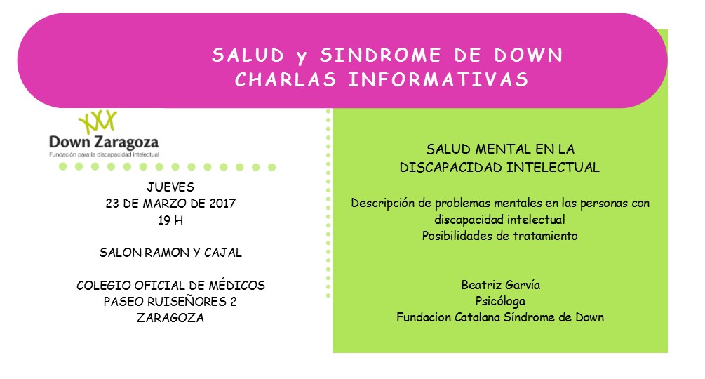 Salud Mental y Discapacidad. Descripción clínica, diagnóstico diferencial, intervención y tratamiento. A cargo de Beatriz Gavía, Fundación Catalana Síndrome de Down el día 23 marzo a las 19,00 horas en el salón Ramón y Cajal del Colegio de Médicos de Zaragoza.