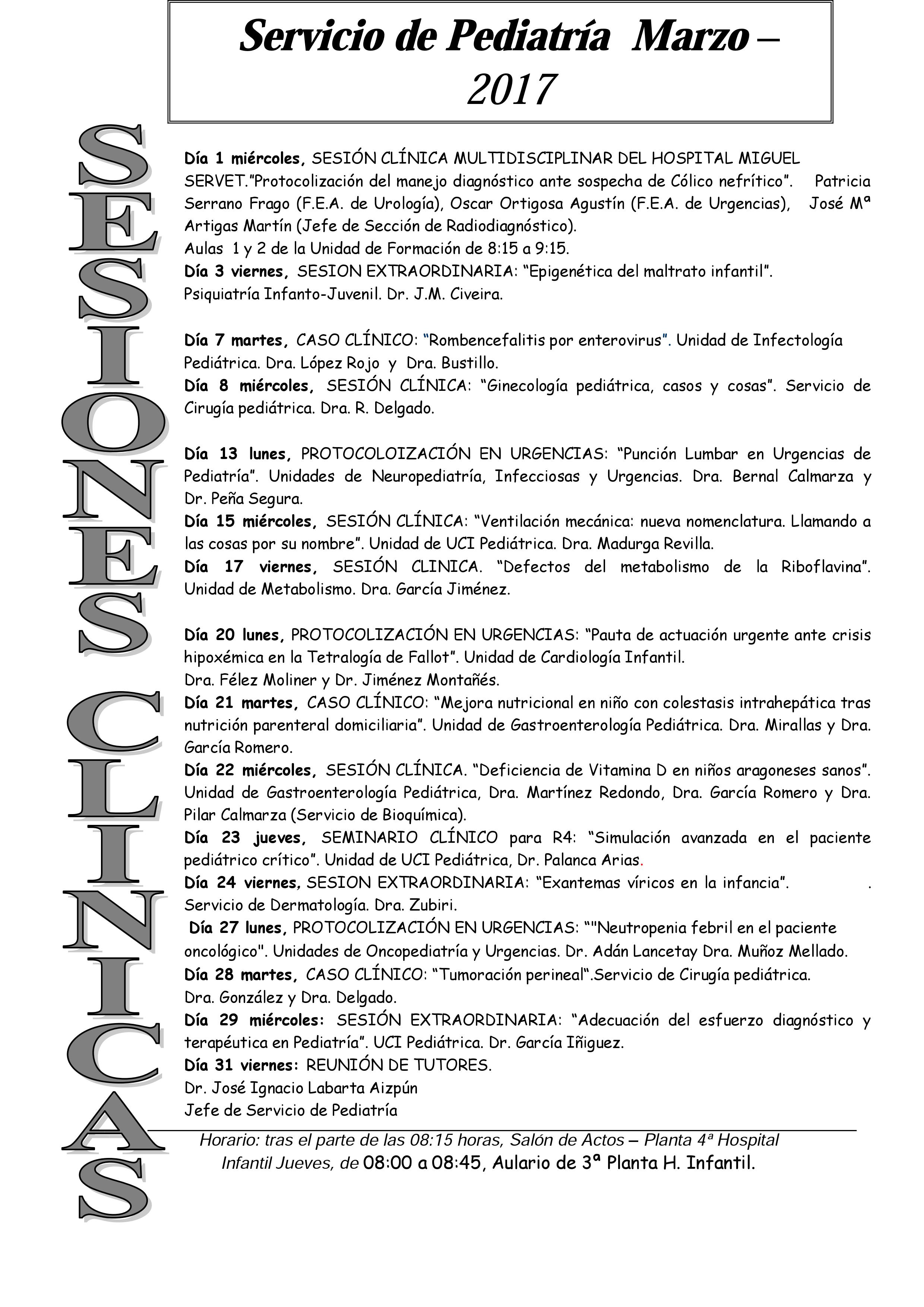 Calendario de sesiones clínicas del Sº de Pediatría, Hospital Infantil Miguel Servet (mes de marzo)