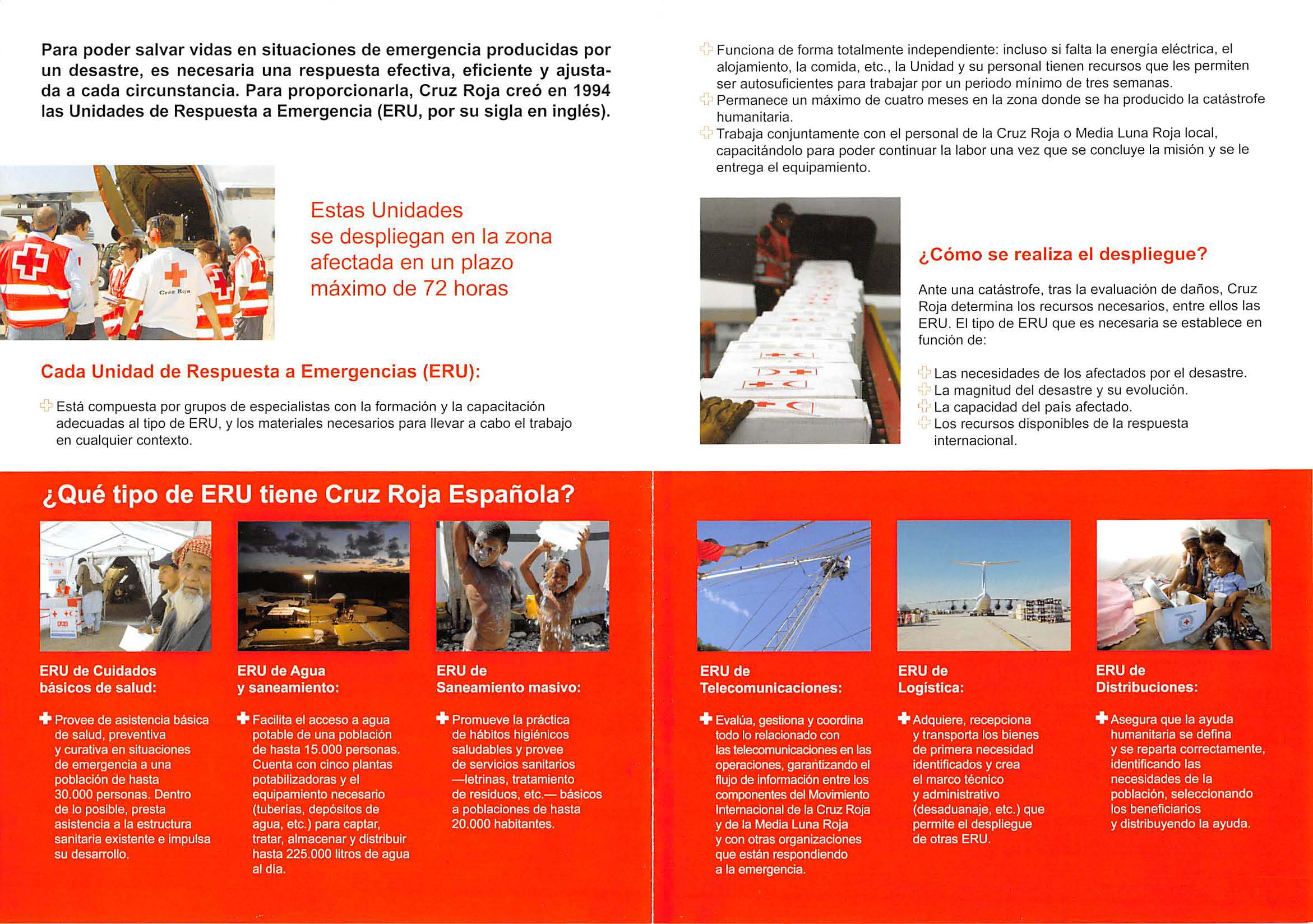 Cruz Roja creó en 1994 las Unidades de Respuesta a Emergencias (ERU, siglas en inglés). Estas Unidades se despliegan en la zona afectada en un plazo máximo de 72 horas.
