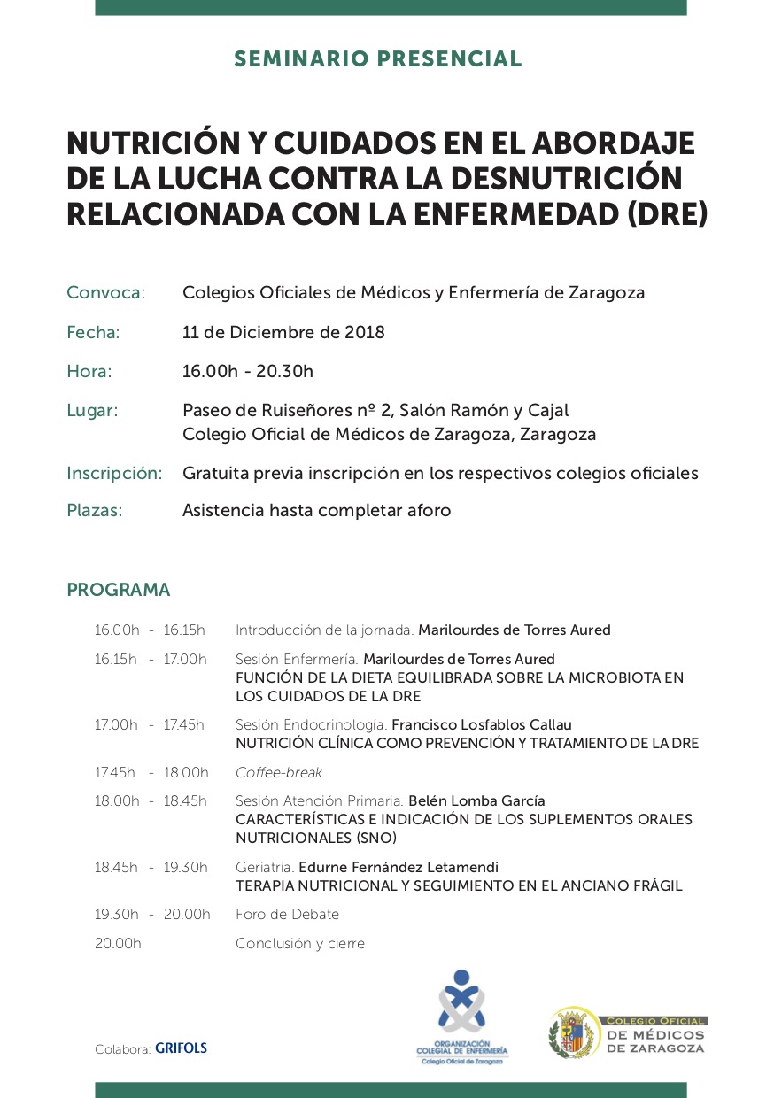 El Colegio de Medicos y de Enfernería de Zaragoza organizan el seminario: “Nutrición y Cuidados en el abordaje de la lucha contra la Desnutrición Relacionada con la Enfermedad (DRE)”.