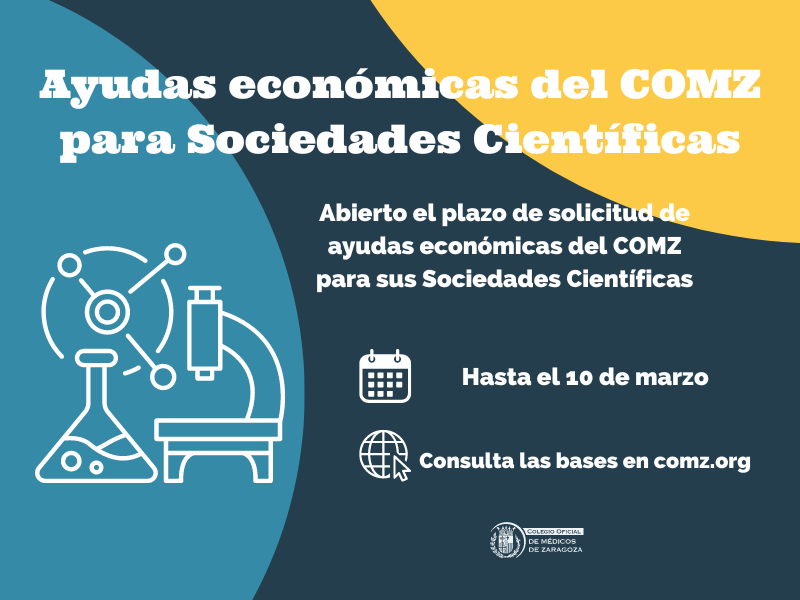 Ya está abierto el plazo de presentación de solicitudes de las ayudas económicas del COMZ destinadas a las Sociedades Científicas con el objetivo de incentivar la realización de proyectos y actividades de carácter sanitario que puedan ser beneficiosas para la sociedad zaragozana, la propia especialidad o el Colegio.
