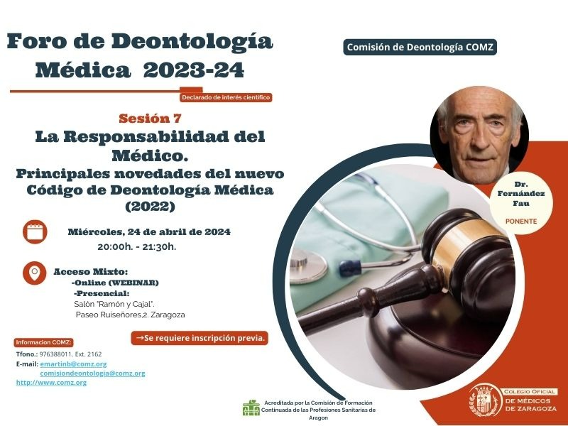 La Responsabilidad del Médico y las principales novedades del nuevo Código de Deontología Médica (2022) serán los temas a tratar en la próxima sesión del Foro de Deontología Médica del COMZ del miércoles 24 de abril a las 20:00 horas.
