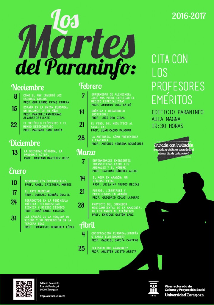 Ciencia y experiencia definen este ciclo de conferencias de los Profesores Eméritos de nuestra Universidad. Lo promueve el Vicerrectorado de Cultura y Política Social en colaboración con la Asociación de Profesores Eméritos (APEUZ). Los conferenciantes, tras completar su periodo activo legal, han sido elegidos ‘eméritos’ por la Universidad, a causa de su currículum y su prestigio, y siguen desarrollando labores de investigación y docencia. Tienen una notoria proyección científica y suman a una dilatada vida académica su amplia experiencia en la enseñanza superior.