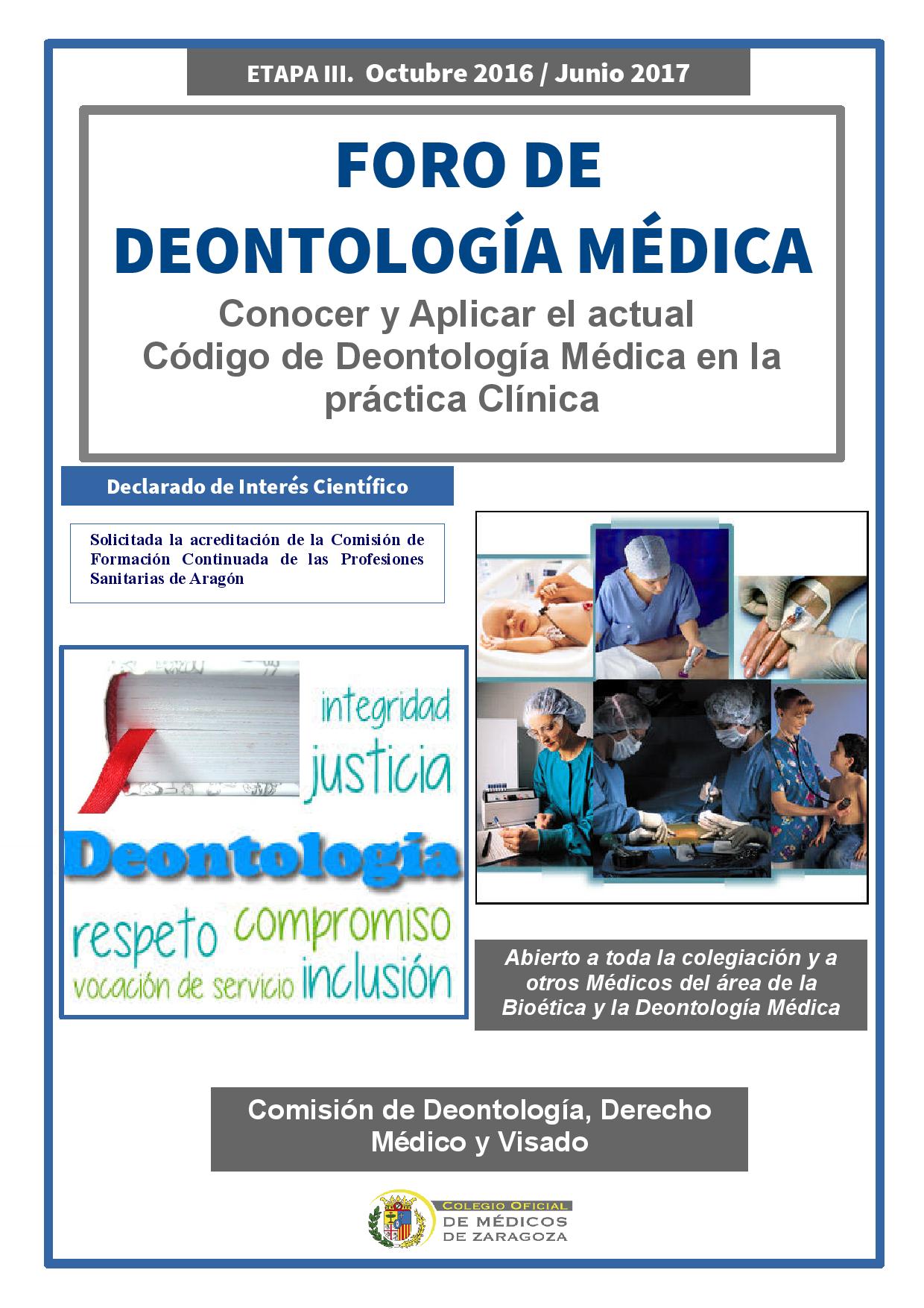 La Comisión de Deontología, Derecho Médico y Visado del Colegio de Médicos de Zaragoza organiza y coordina el Foro de Deontología Médica.