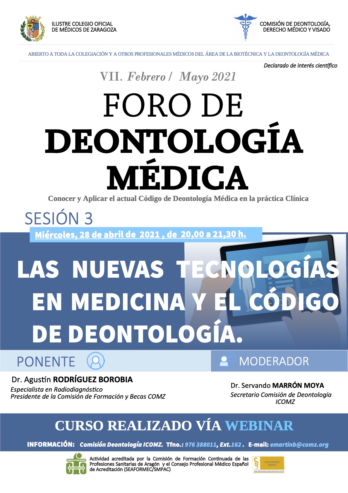 07 Abr 2021 La próxima sesión del Foro de Deontología tendrá lugar el 28 de abril Noticias La próxima sesión del Foro de Deontología tendrá lugar el 28 de abril INSCRIPCIÓN EN: http://www.comz.org/formacion-dpc/curso/foro-de-deontologia-medica-las-nuevas-tecnologias-en-medicina-y-el-codigo-de-deontologia