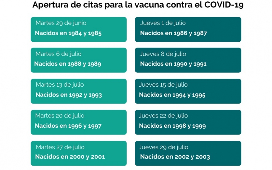 Así, de acuerdo con los suministros de las diferentes vacunas previstos para el mes de julio, se establece un ritmo de incorporación de los restantes grupos de edad según el siguiente calendario: